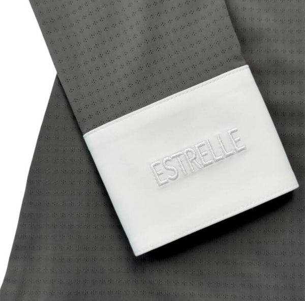 Elegant toernooishirt gemaakt van een lichte, geperforeerde stof en sprankelende kristallen op de kraag.