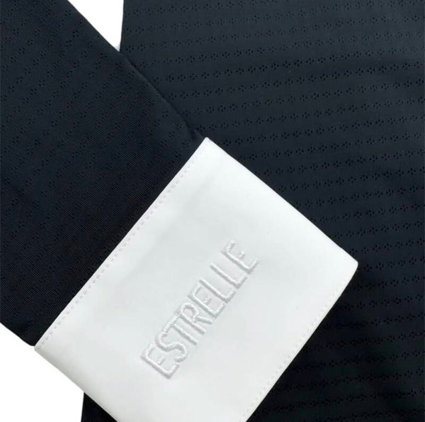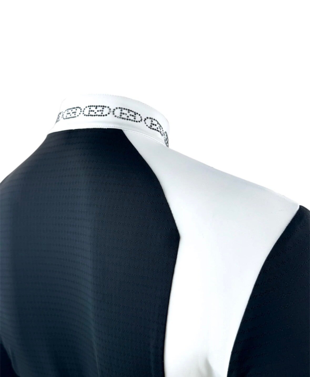 Elegant toernooishirt gemaakt van een lichte, geperforeerde stof en sprankelende kristallen op de kraag.