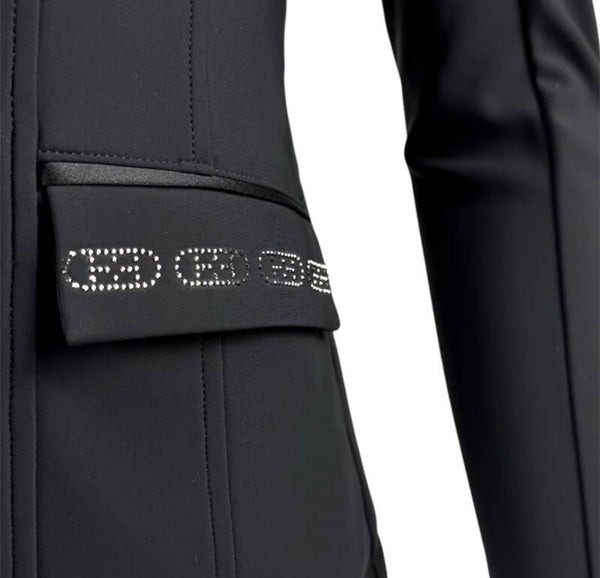 Verliebe Dich in de eerste toernooijas van Estrelle. Functie is geschikt voor tijdloze elegantie en dat is hier bijzonder goed. Het lichte, ademende, thermoregulerende en bi-elastische functionele materiaal past optimaal bij elke beweging van je lichaam en zorgt voor een aangenaam draagvermogen bij elke temperatuur. Edel glinsterende Satin Details en de zwart-metallic funkelende kristallen van Swarovski® garanderen de perfecte toernooiuitstraling. Het toernooijack is getailleerd gesneden en heeft naast de goede pasvorm ook een verborgen ritssluiting en twee verborgen zakken.